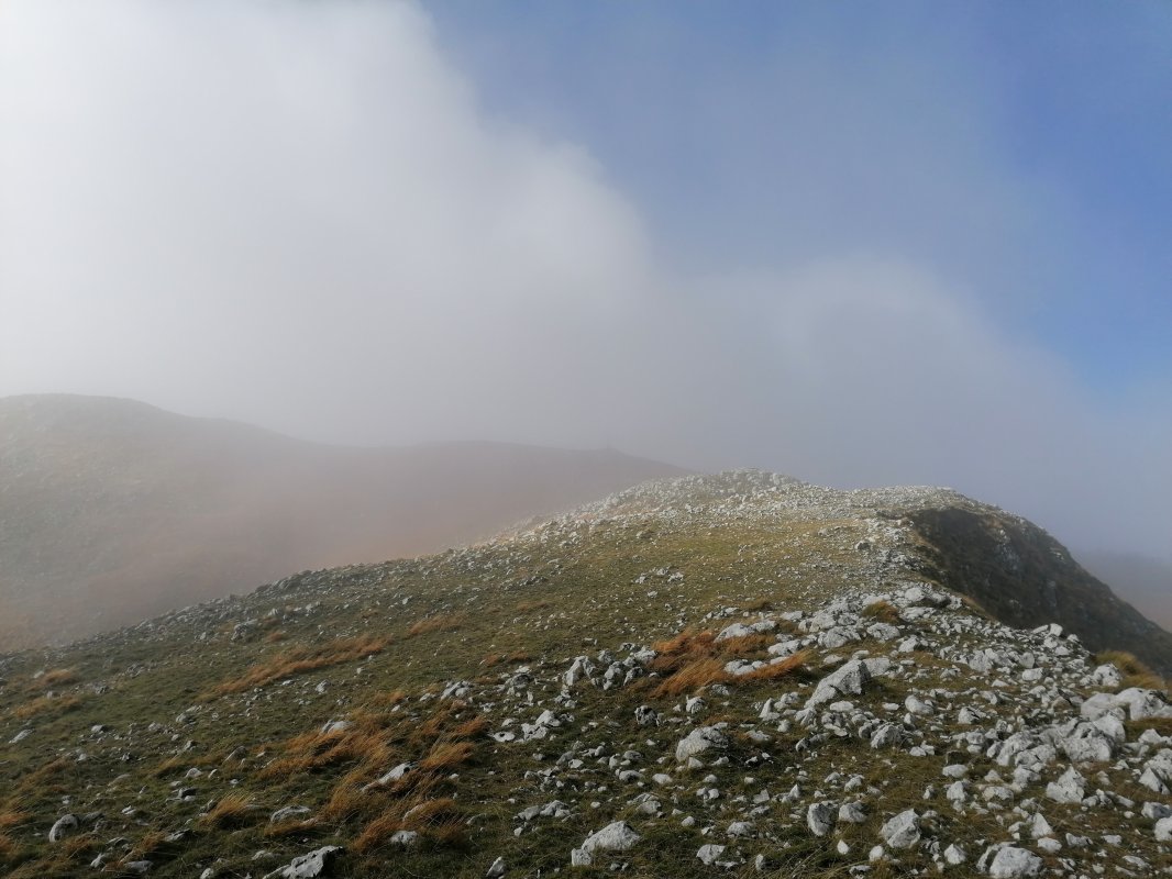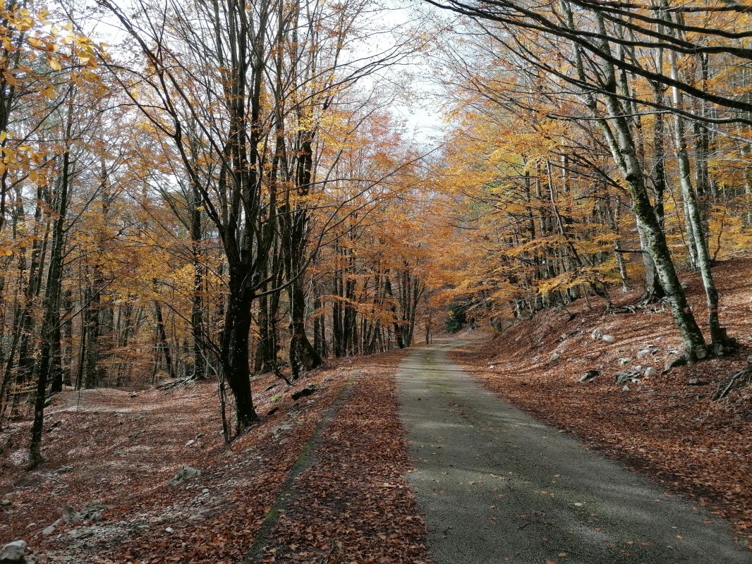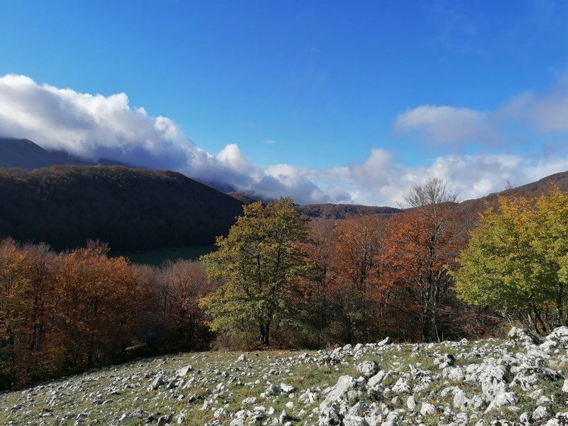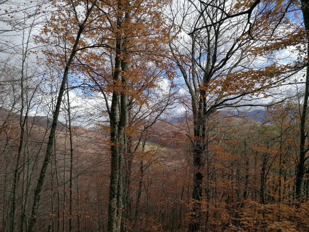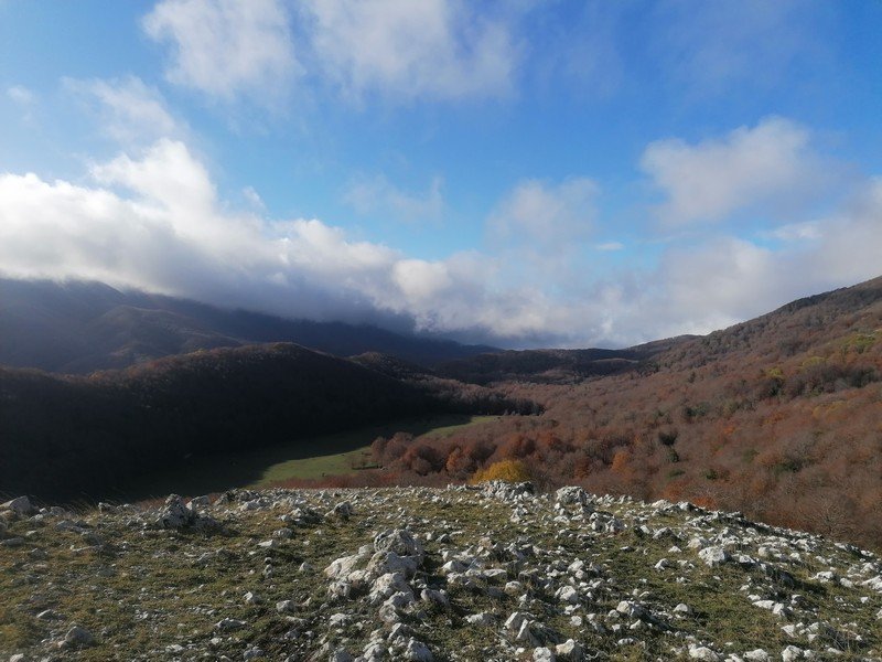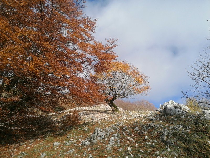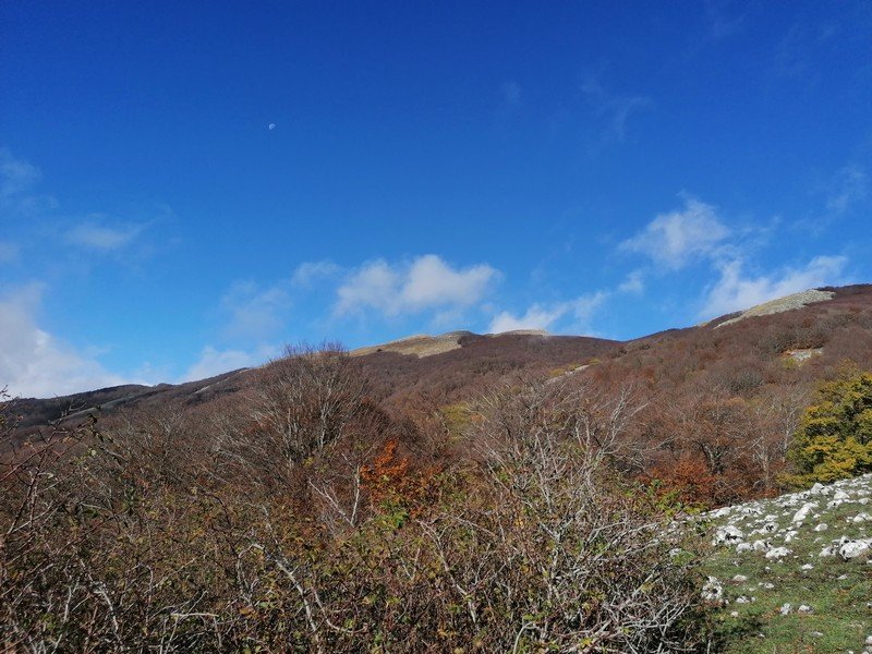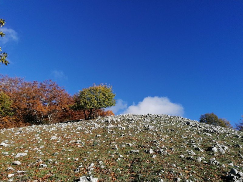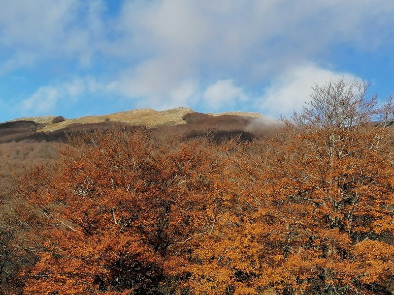 Saliti in vetta, scenderemo lungo una nuova direttissima di cresta che ci condurrà fino ad un bosco misto di cerro, faggio e acero che tramite un canalone di foglie porta alla strada principale per il piano Migliato.